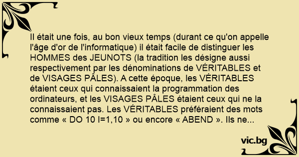 Il était une fois, au bon vieux temps (durant ce qu'on appelle l'âge d'or de l'informatique) il était facile de distinguer les HOMMES des JEUNOTS (la tradition les désigne aussi respectivement par les dénominations de VÉRITABLES et de VISAGES PÂLES). A cette époque, les VÉRITABLES étaient ceux qui connaissaient la programmation des ordinateurs, et les VISAGES PÂLES étaient ceux qui ne la connaissaient pas. Les VÉRITABLES préféraient des mots comme « DO 10 I=1,10 » ou encore « ABEND ». Ils ne parlaient d'ailleurs qu'en majuscules. Le reste du monde disait des choses du genre « Les ordinateurs sont trop compliqués pour moi » ou bien encore « Les ordinateurs ne me disent rien, ils sont trop impersonnels ». Des recherches récentes ont d'ailleurs montré que les VÉRITABLES n'ont besoin de rien dire à personne, et qu'en plus ils n'ont pas peur d'être impersonnels.