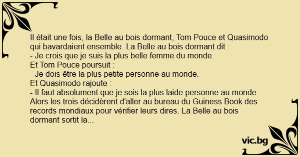 Il était une fois, la Belle au bois dormant, Tom Pouce et Quasimodo qui bavardaient ensemble. La Belle au bois dormant dit :