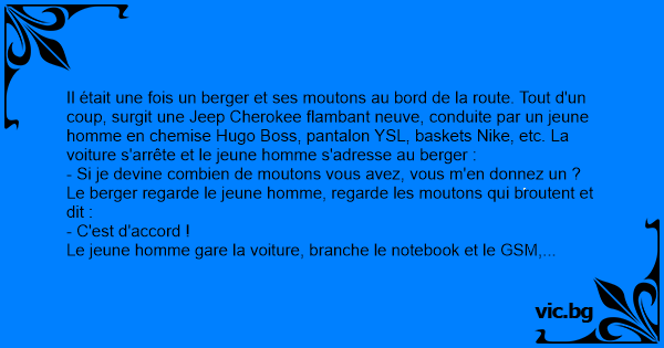 Il était une fois un berger et ses moutons au bord de la route. Tout d'un coup, surgit une Jeep Cherokee flambant neuve, conduite par un jeune homme en chemise Hugo Boss, pantalon YSL, baskets Nike, etc. La voiture s'arrête et le jeune homme s'adresse au berger :