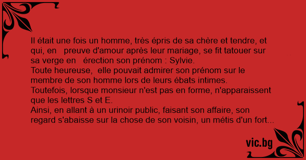 Il était une fois un homme, très épris de sa chère et tendre, et qui, en preuve d'amour après leur mariage, se fit tatouer sur sa verge en érection son prénom : Sylvie.
