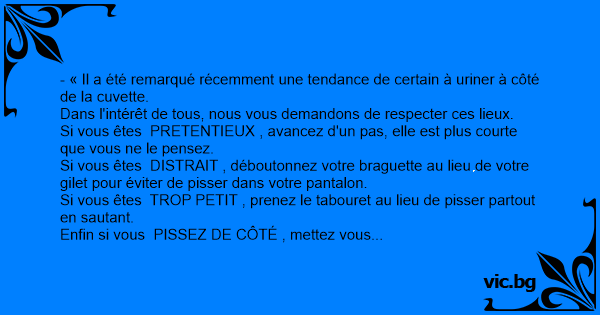 - « Il a été remarqué récemment une tendance de certain à uriner à côté de la cuvette.