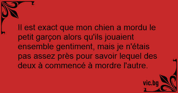 Il est exact que mon chien a mordu le petit garçon alors qu'ils jouaient ensemble gentiment, mais je n'étais pas assez près pour savoir lequel des deux à commencé à mordre l'autre.