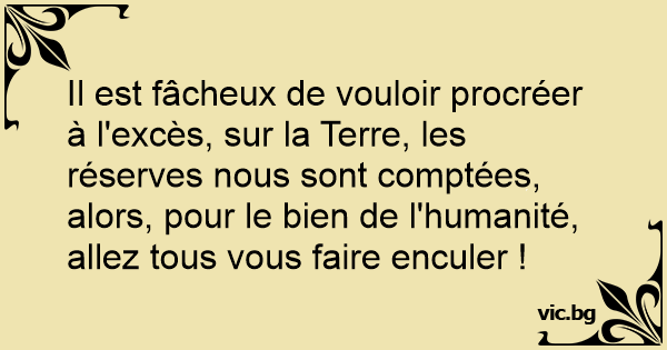 Il est fâcheux de vouloir procréer à l'excès, sur la Terre, les réserves nous sont comptées, alors, pour le bien de l'humanité, allez tous vous faire enculer !