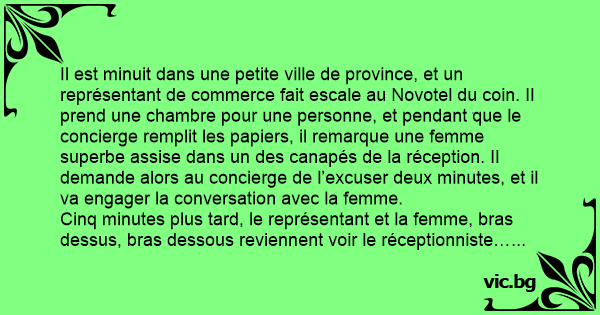 Il est minuit dans une petite ville de province, et un représentant de commerce fait escale au Novotel du coin. Il prend une chambre pour une personne, et pendant que le concierge remplit les papiers, il remarque une femme superbe assise dans un des canapés de la réception. Il demande alors au concierge de l’excuser deux minutes, et il va engager la conversation avec la femme. Cinq minutes plus таrd, le représentant et la femme, bras dessus, bras dessous reviennent voir le réceptionniste… Le représentant dit : - C’est incroyable, ma femme que voici et moi-même sommes représentants de commerce tous les deux. Et le hasard a fait que nous choisissions tous deux votre hôtel pour cette nuit. Pouvez-vous nous placer dans une chambre double ? Puis il rejoint sa femme, et ils vont se coucher. Le lendemain matin, alors que la femme est déjà partie, le représentant passe à la réception pour payer, et là STUPEUR : la note est de 900 euros ! - Vous vous êtes trompé. Je ne suis resté qu’une nuit, je ne dois quand même pas payer aussi cher ! Et le réceptionniste lui répond : - Vous n’êtes resté qu’une nuit, mais votre « femme » couche ici depuis trois semaines…