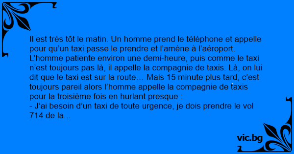 Il est très tôt le matin. Un homme prend le téléphone et appelle pour qu’un taxi passe le prendre et l’amène à l’aéroport. L’homme patiente environ une demi-heure, puis comme le taxi n’est toujours pas là, il appelle la compagnie de taxis. Là, on lui dit que le taxi est sur la route… Mais 15 minute plus таrd, c’est toujours pareil alors l’homme appelle la compagnie de taxis pour la troisième fois en hurlant presque :
