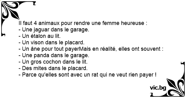 Il faut 4 animaux pour rendre une femme heureuse :, - une jaguar dans le garage, - un étalon au lit, - un vison dans le placard, - un âne pour tout payer
