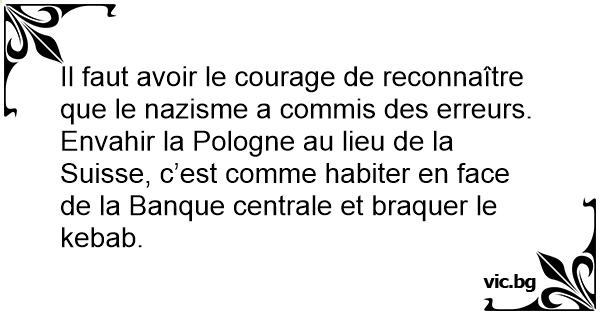 Il faut avoir le courage de reconnaître que le nazisme a commis des erreurs. Envahir la Pologne au lieu de la Suisse, c’est comme habiter en face de la Banque centrale et braquer le kebab.