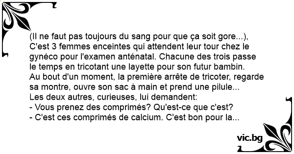 C'est 3 femmes enceintes qui attendent leur tour chez le gynéco pour l'examen anténatal. Chacune des trois passe le temps en tricotant une layette pour son futur bambin.