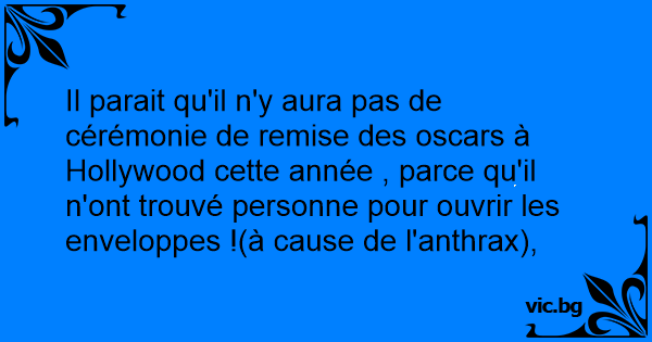 Il parait qu'il n'y aura pas de cérémonie de remise des oscars à Hollywood cette année , parce qu'il n'ont trouvé personne pour ouvrir les enveloppes !(à cause de l'anthrax),