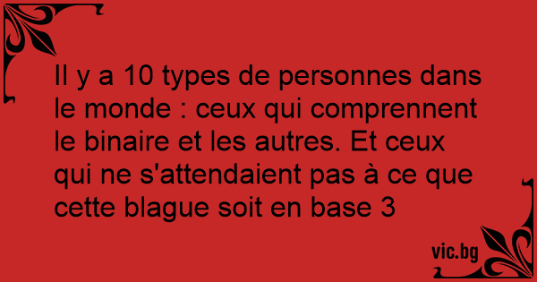 Il y a 10 types de personnes dans le monde : ceux qui comprennent le binaire et les autres. Et ceux qui ne s'attendaient pas à ce que cette blague soit en base 3