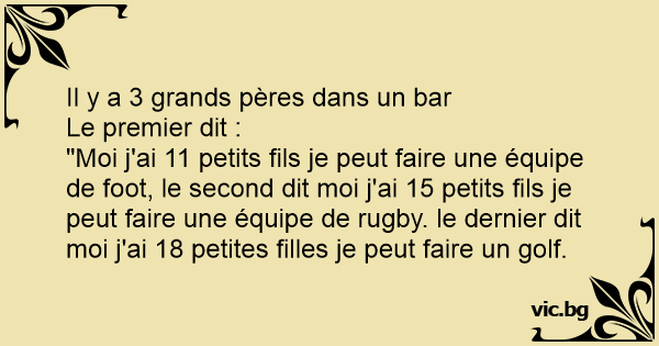 "Moi j'ai 11 petits fils je peut faire une équipe de foot, le second dit moi j'ai 15 petits fils je peut faire une équipe de rugby. le dernier dit moi j'ai 18 petites filles je peut faire un golf.