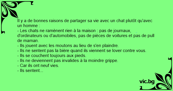 - Les chats ne ramènent rien à la maison : pas de journaux, d'ordinateurs ou d'automobiles, pas de pièces de voitures et pas de pull de maman.