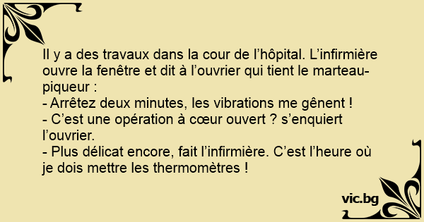 Il y a des travaux dans la cour de l’hôpital. L’infirmière ouvre la fenêtre et dit à l’ouvrier qui tient le marteau-piqueur :
