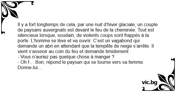 Il y a fort longtemps de cela, par une nuit d’hiver glaciale, un couple de paysans auvergnats est devant le feu de la cheminée. Tout est silencieux lorsque, soudain, de violents coups sont frappés à la porte. L’homme se lève et va ouvrir. C’est un vagabond qui demande un abri en attendant que la tempête de neige s’arrête. Il vient s’asseoir au coin du feu et demande timidement :