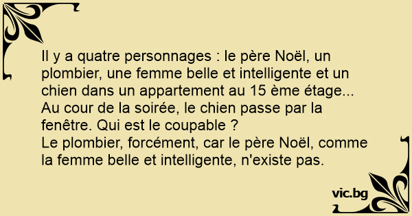 Il y a quatre personnages : le père Noël, un plombier, une femme belle et intelligente et un chien dans un appartement au 15 ème étage... Au cour de la soirée, le chien passe par la fenêtre. Qui est le coupable ?