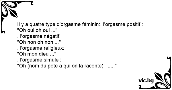 - Vet du att det finns fyra olika typer av kvinnlig orgasm? - Nej, det visste jag inte. Vilka är det? - Det är den positiva orgasmen, den negativa, den religiösa och den falska. - Vad är skillnaden...