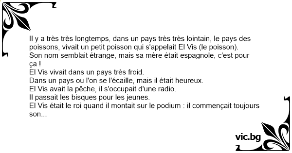 Il y a très très longtemps, dans un pays très très lointain, le pays des poissons, vivait un petit poisson qui s'appelait El Vis (le poisson).