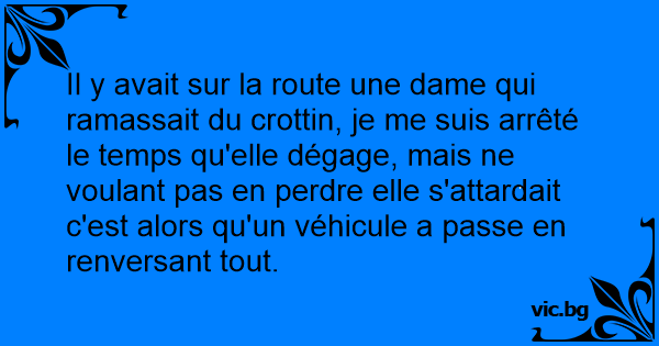 Il y avait sur la route une dame qui ramassait du crottin, je me suis arrêté le temps qu'elle dégаgе, mais ne voulant pas en perdre elle s'attardait c'est alors qu'un véhicule a passe en renversant tout.