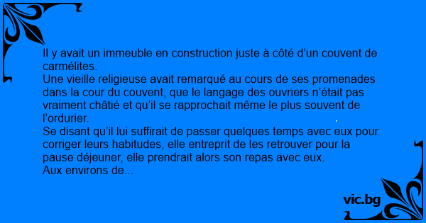 Une vieille religieuse avait remarqué au cours de ses promenades dans la cour du couvent, que le langage des ouvriers n’était pas vraiment châtié et qu’il se rapprochait même le plus souvent de l’ordurier.