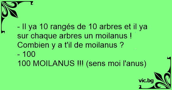 - Il ya 10 rangés de 10 arbres et il ya sur chaque arbres un moilanus ! Combien y a t'il de moilanus ?