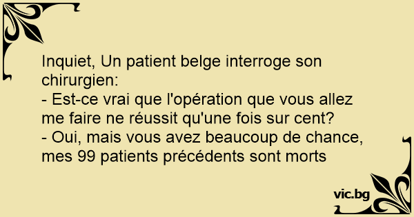 Inquiet, Un patient belge interroge son chirurgien: - Est-ce vrai que l'opération que vous allez me faire ne réussit qu'une fois sur cent? - Oui, mais vous avez beaucoup de chance, mes 99 patients précédents sont morts