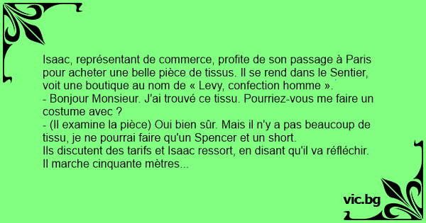 Isaac, représentant de commerce, profite de son passage à Paris pour acheter une belle pièce de tissus. Il se rend dans le Sentier, voit une boutique au nom de « Levy, confection homme ».