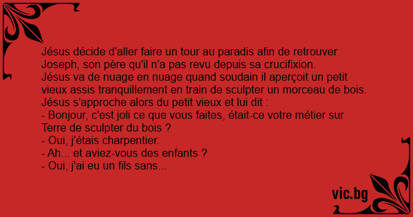Jésus va de nuage en nuage quand soudain il aperçoit un petit vieux assis tranquillement en train de sculpter un morceau de bois.