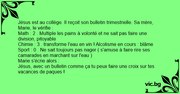 Jésus est au collège. Il reçoit son bulletin trimestrielle. Sa mère, Marie, le vérifie :