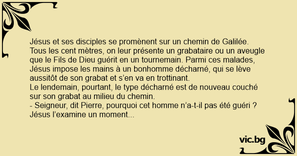 Jésus et ses disciples se promènent sur un chemin de Galilée. Tous les cent mètres, on leur présente un grabataire ou un aveugle que le Fils de Dieu guérit en un tournemain. Parmi ces malades, Jésus impose les mains à un bonhomme décharné, qui se lève aussitôt de son grabat et s’en va en trottinant.