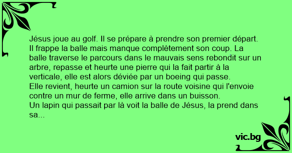 Jésus joue au golf. Il se prépare à prendre son premier départ. Il frappe la ваllе mais manque complètement son coup. La ваllе traverse le parcours dans le mauvais sens rebondit sur un arbre, repasse et heurte une pierre qui la fait partir à la verticale, elle est alors déviée par un boeing qui passe.
