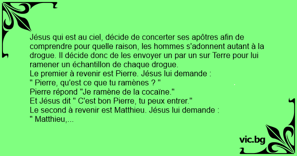 Jésus qui est au ciel, décide de concerter ses apôtres afin de comprendre pour quelle raison, les hommes s'adonnent autant à la drogue. Il décide donc de les envoyer un par un sur Terre pour lui ramener un échantillon de chaque drogue.