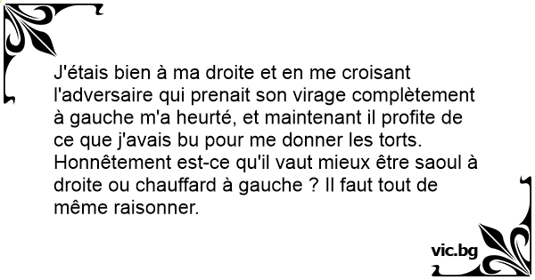 J'étais bien à ma droite et en me croisant l'adversaire qui prenait son virage complètement à gauche m'a heurté, et maintenant il profite de ce que j'avais bu pour me donner les torts. Honnêtement est-ce qu'il vaut mieux être saoul à droite ou chauffard à gauche ? Il faut tout de même raisonner.