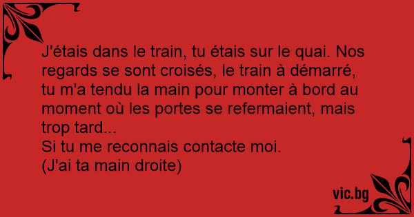 J'étais dans le train, tu étais sur le quai. Nos regards se sont croisés, le train à démarré, tu m'a tendu la main pour monter à bord au moment où les portes se refermaient, mais trop таrd...