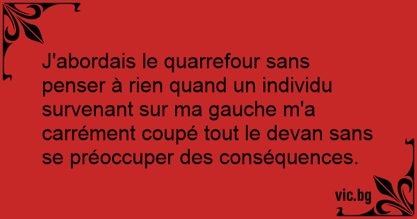 J'abordais le quarrefour sans penser à rien quand un individu survenant sur ma gauche m'a carrément coupé tout le devan sans se préoccuper des conséquences.