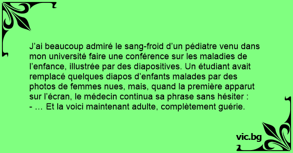 J’ai beaucoup admiré le sang-froid d’un pédiatre venu dans mon université faire une conférence sur les maladies de l’enfance, illustrée par des diapositives. Un étudiant avait remplacé quelques diapos d’enfants malades par des photos de femmes nues, mais, quand la première apparut sur l’écran, le médecin continua sa phrase sans hésiter :