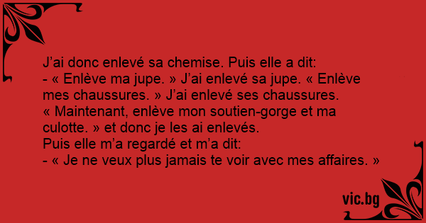 - « Enlève ma jupe. » J’ai enlevé sa jupe. « Enlève mes chaussures. » J’ai enlevé ses chaussures. « Maintenant, enlève mon soutien-gorge et ma culotte. » et donc je les ai enlevés.