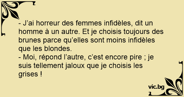 - J’ai horreur des femmes infidèles, dit un homme à un autre. Et je choisis toujours des brunes parce qu’elles sont moins infidèles que les blondes.
