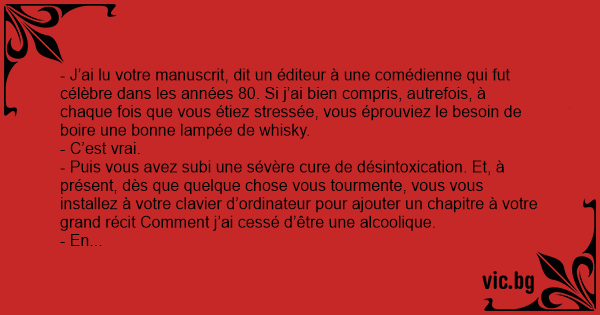 - J’ai lu votre manuscrit, dit un éditeur à une comédienne qui fut célèbre dans les années 80. Si j’ai bien compris, autrefois, à chaque fois que vous étiez stressée, vous éprouviez le besoin de boire une воnnе lampée de whisky.