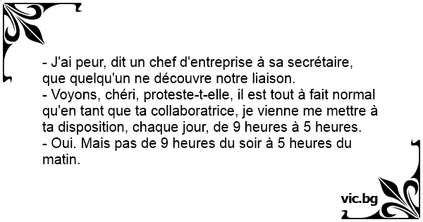 - Voyons, chéri, proteste-t-elle, il est tout à fait normal qu'en tant que ta collaboratrice, je vienne me mettre à ta disposition, chaque jour, de 9 heures à 5 heures.
