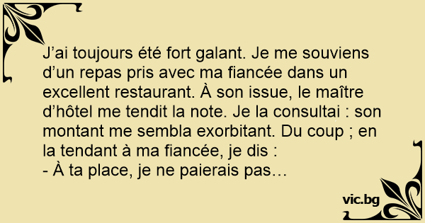 J’ai toujours été fort galant. Je me souviens d’un repas pris avec ma fiancée dans un excellent restaurant. À son issue, le maître d’hôtel me tendit la note. Je la consultai : son montant me sembla exorbitant. Du coup ; en la tendant à ma fiancée, je dis :