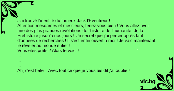 Attention mesdames et messieurs, tenez vous bien ! Vous allez avoir une des plus grandes révélations de l'histoire de l'humanité, de la Préhistoire jusqu'à nos jours ! Un secret que j'ai percer après tant d'années de recherches ! Il s'est enfin ouvert à moi ! Je vais maintenant le révéler au monde entier !