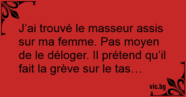 J’ai trouvé le masseur assis sur ma femme. Pas moyen de le déloger. Il prétend qu’il fait la grève sur le tas…
