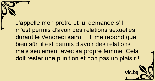 J’appelle mon prêtre et lui demande s’il m’est permis d’avoir des relations sexuelles durant le Vendredi sаinт… Il me répond que bien sûr, il est permis d’avoir des relations mais seulement avec sa propre femme. Cela doit rester une punition et non pas un plaisir !