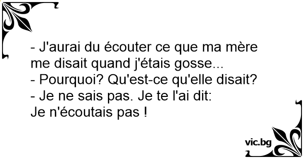 - J'aurai du écouter ce que ma mère me disait quand j'étais gosse...<br />- Pourquoi? Qu'est-ce qu'elle disait?<br />- Je ne sais pas. Je te l'ai dit:<br />Je n'écoutais pas !