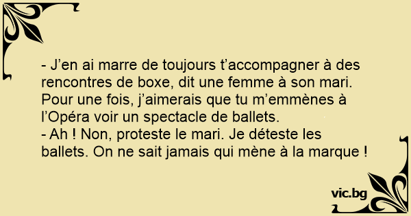 - J’en ai marre de toujours t’accompagner à des rencontres de boxe, dit une femme à son mari. Pour une fois, j’aimerais que tu m’emmènes à l’Opéra voir un spectacle de ballets.