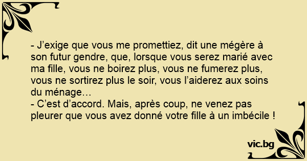 - J’exige que vous me promettiez, dit une mégère à son futur gendre, que, lorsque vous serez marié avec ma fille, vous ne boirez plus, vous ne fumerez plus, vous ne sortirez plus le soir, vous l’aiderez aux soins du ménage…