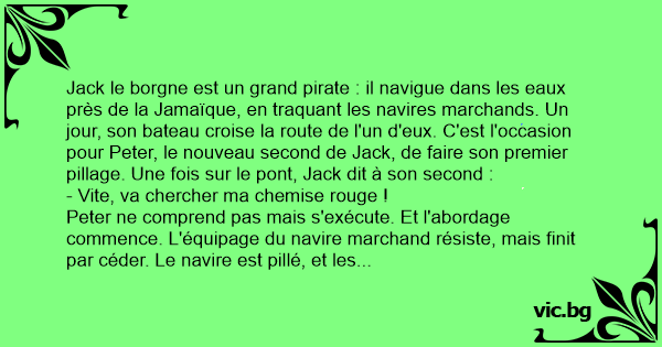 - Vois-tu, dit Jack, si je suis blessé au combat, les hommes pourraient être découragés en voyant leur capitaine en sang. Avec ma chemise rouge, ils ne voient rien !