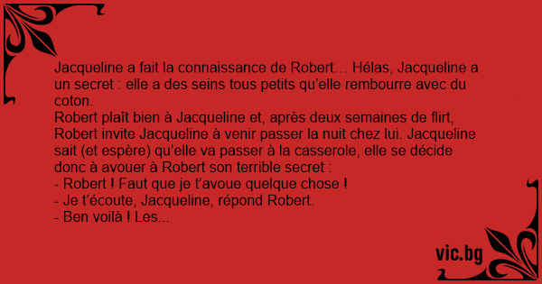 Robert plaît bien à Jacqueline et, après deux semaines de flirt, Robert invite Jacqueline à venir passer la nuit chez lui. Jacqueline sait (et espère) qu’elle va passer à la casserole, elle se décide donc à avouer à Robert son terrible secret :