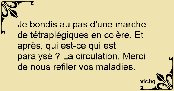 Je bondis au pas d'une marche de tétraplégiques en colère. Et après, qui est-ce qui est paralysé ? La circulation. Merci de nous refiler vos maladies.