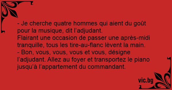 - Bon, vous, vous, vous et vous, désigne l’adjudant. Allez au foyer et transportez le piano jusqu’à l’appartement du commandant.